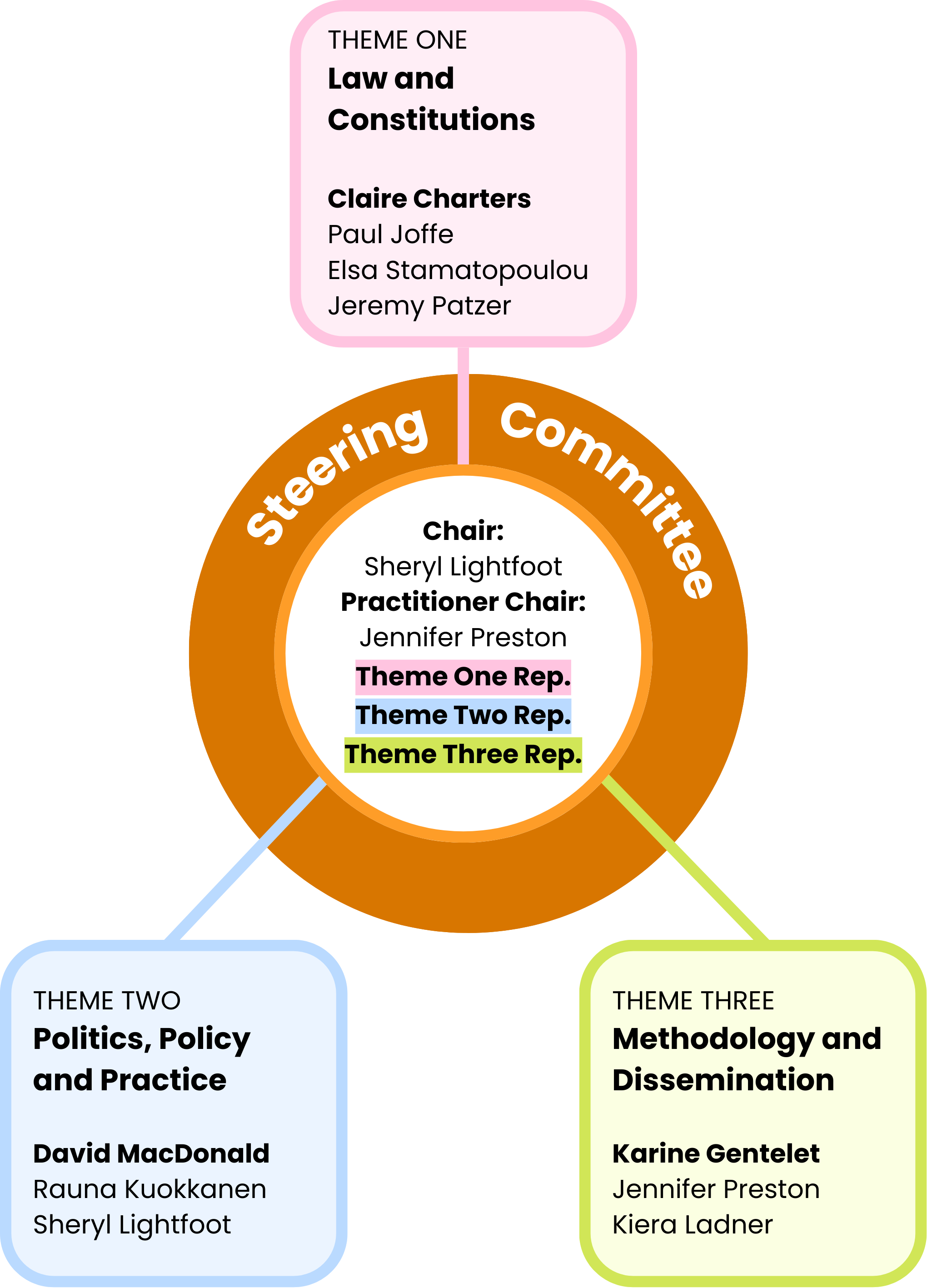The structure of the partnership will follow the three themes identified in earlier workshops held at UBC and virtually: 1) Law and Constitutions, 2) Politics, Policy and Practice, and 3) Methodology and Dissemination. In order to facilitate ongoing decision-making regarding activities and goals of the network, we will form a steering committee, which will consist of one co-applicant researcher to represent each of the three research themes, plus one Indigenous and NGO practitioner co-applicant. On this steering committee, chaired by Lightfoot, Charters will represent theme 1, MacDonald will represent theme 2 and Gentelet theme 3. In addition, Preston will sit on the steering committee to represent the needs and interests of practitioner partners throughout the network activities.
